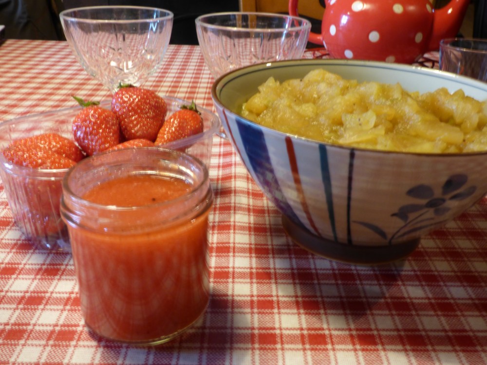 Le printemps pas toujours facile de varier les desserts et pourtant on a envie d’ajouter en fin de repas des notes de fraîcheur, d’éviter pour quelques temps les crèmes caramel, les riz au lait… Alors on a beau faire le tour des étals, à part la fraise point d’autres fruits de saison. Nous avons donc réalisé un dessert avec les dernières pommes, fruit d’automne, la rhubarbe du jardin ( le pied est magnifique et donne déjà ) et puis la fraise, fruit de printemps. Ainsi on passe en douceur d’une saison à l’autre.