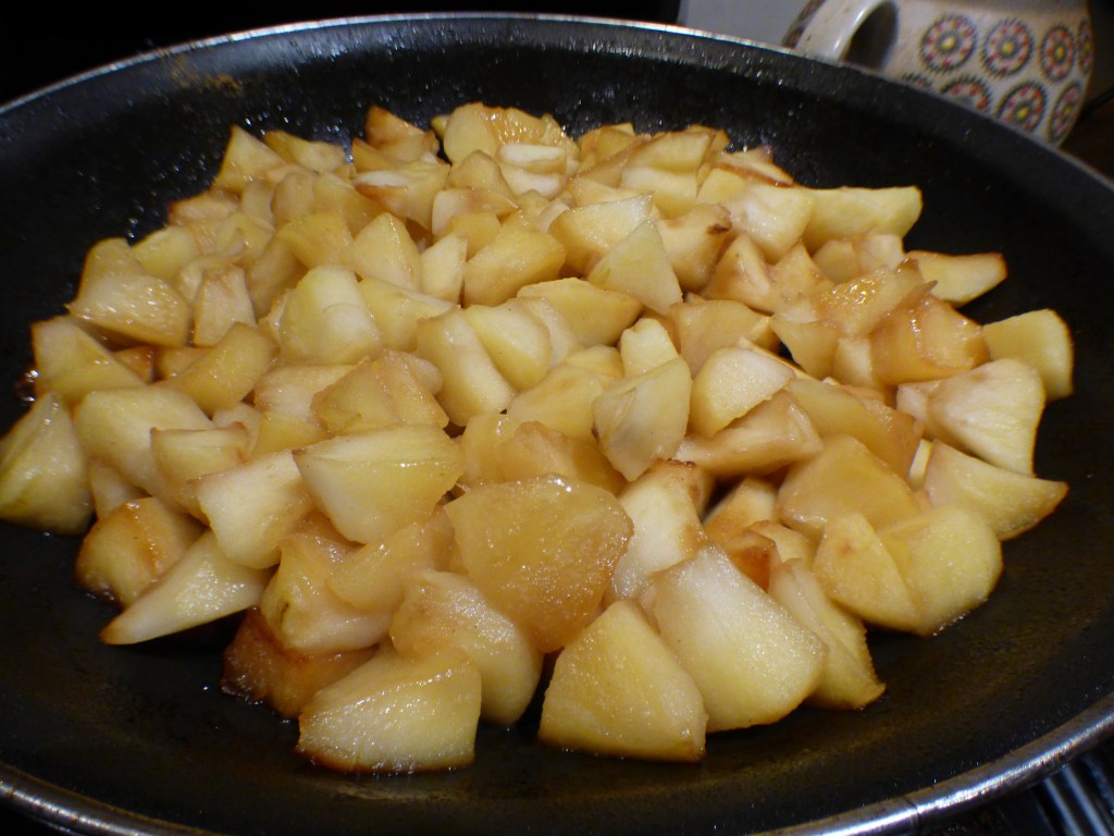 Cuire ensuite les pommes à la poêle après les avoir coupées en dés. Je mets juste deux cuillères d’eau et je couvre. Avant la fin de la cuisson je saupoudre d’un peu de sucre rapadura pour caraméliser un peu les fruits et je flambe avec un peu de calvados.