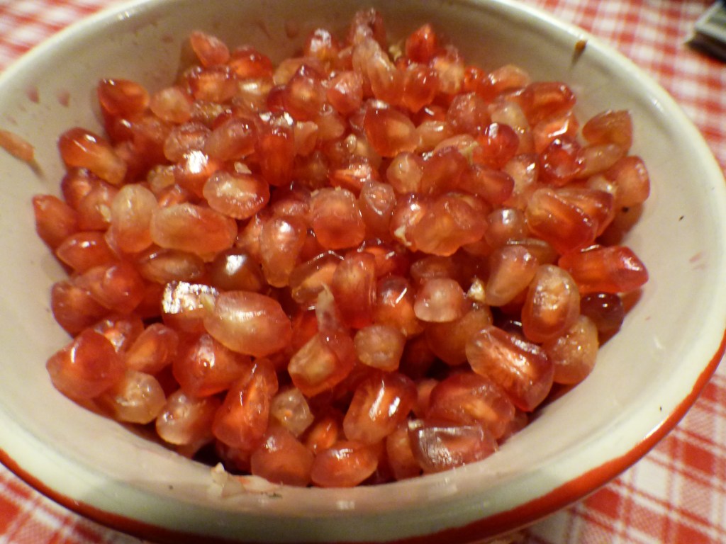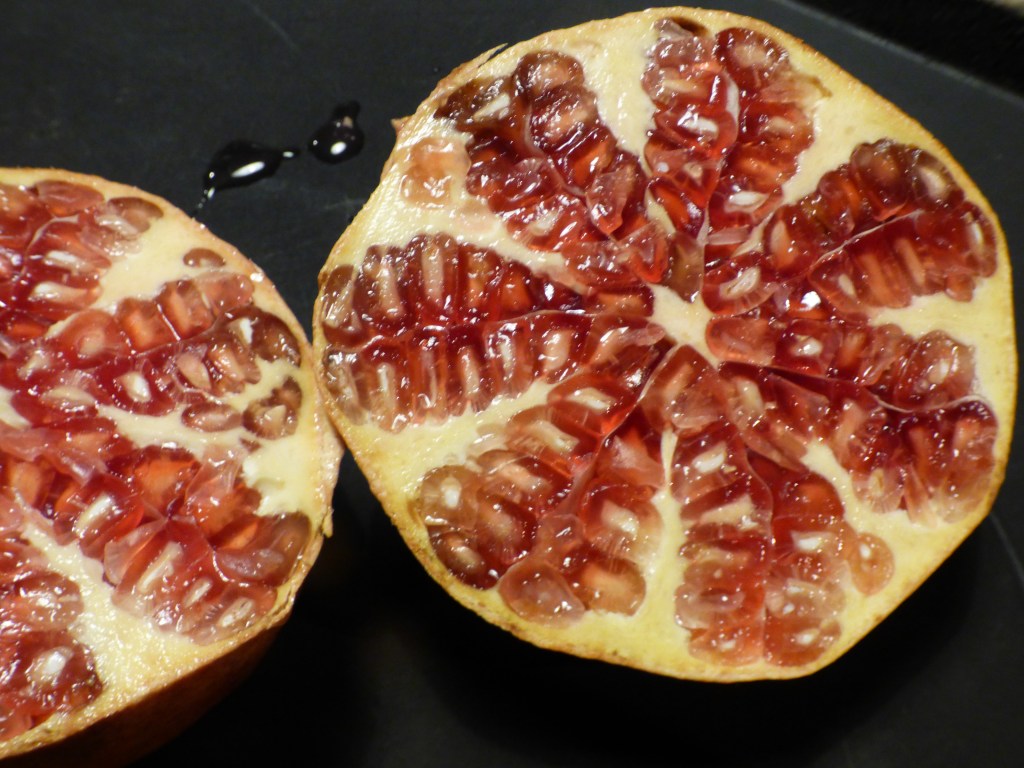 J’ai bien aimé réaliser cette recette qui par bien des étapes m’a rappelé des moments de l’enfance. Des galettes au sarrasin maman en faisait souvent l’hiver. Nous n’aimions pas trop nous les enfants sa texture rêche, puis elle a mélangé les deux farines. Les pommes cuites étaient souvent notre dessert car nous en avions. Elles conservaient tout l’hiver au grenier. Quant à la grenade, notre tante Olga qui venait nous voir régulièrement le sac chargé de livres et de gâteries pour nous, en avait ramené une de la ville. La première qu’il nous était donné à voir. Je me souviens parfaitement de l’émerveillement en partageant le fruit. Plus que le goût c’est la disposition des graines qui nous avait épatés!
