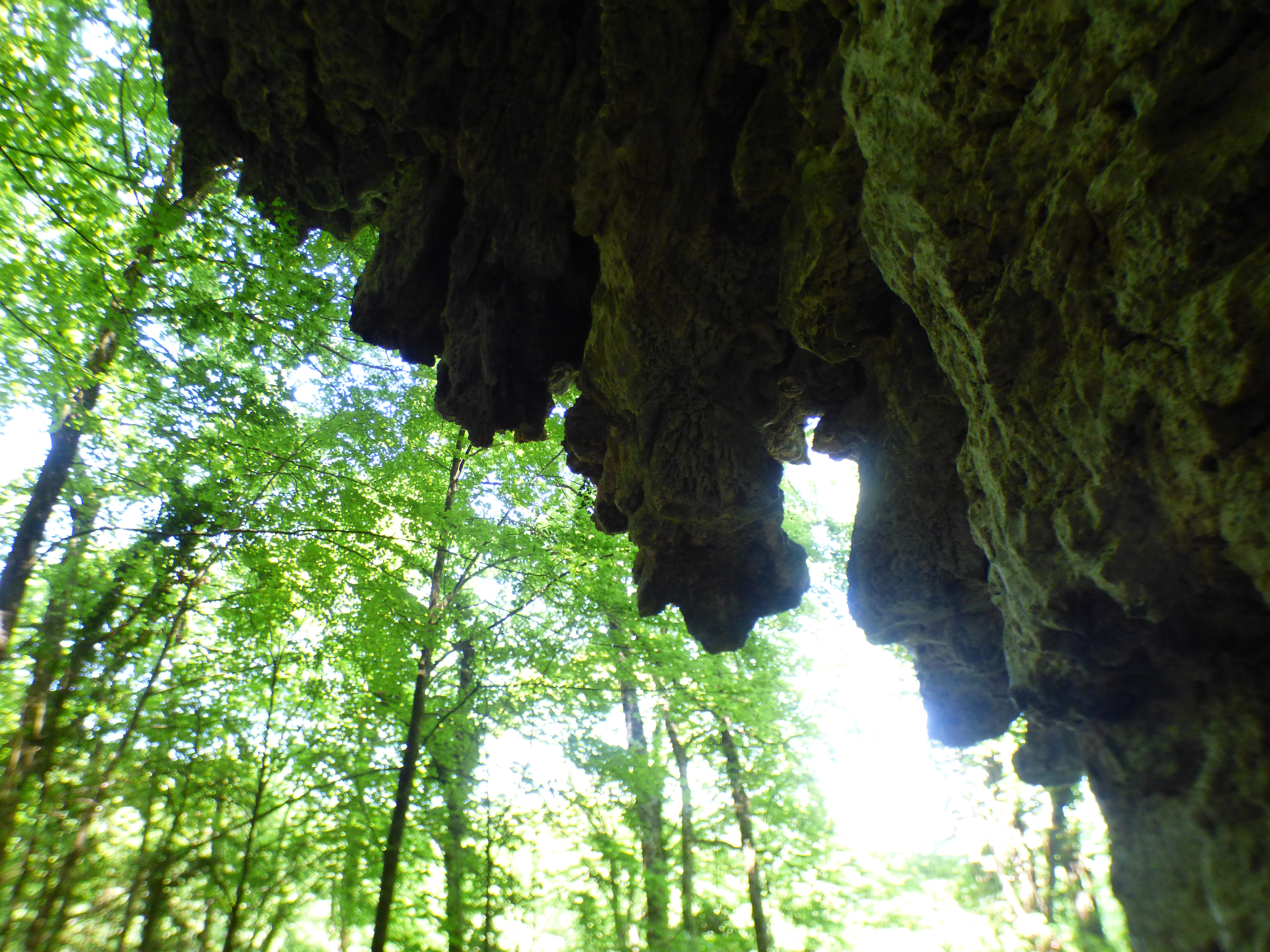 A Roquefort les cascades, s’est produit un phénomène rare et fragile qui porte le nom de tufière (massif de tuf). Le tuf roche très poreuse et légère résulte d’un dépôt par l’eau saturée en calcaire. L’eau de pluie devenue acide au contact du sol fait ici des miracles . Elle dissout le calcaire du massif dans lequel elle circule formant fissures et galeries.