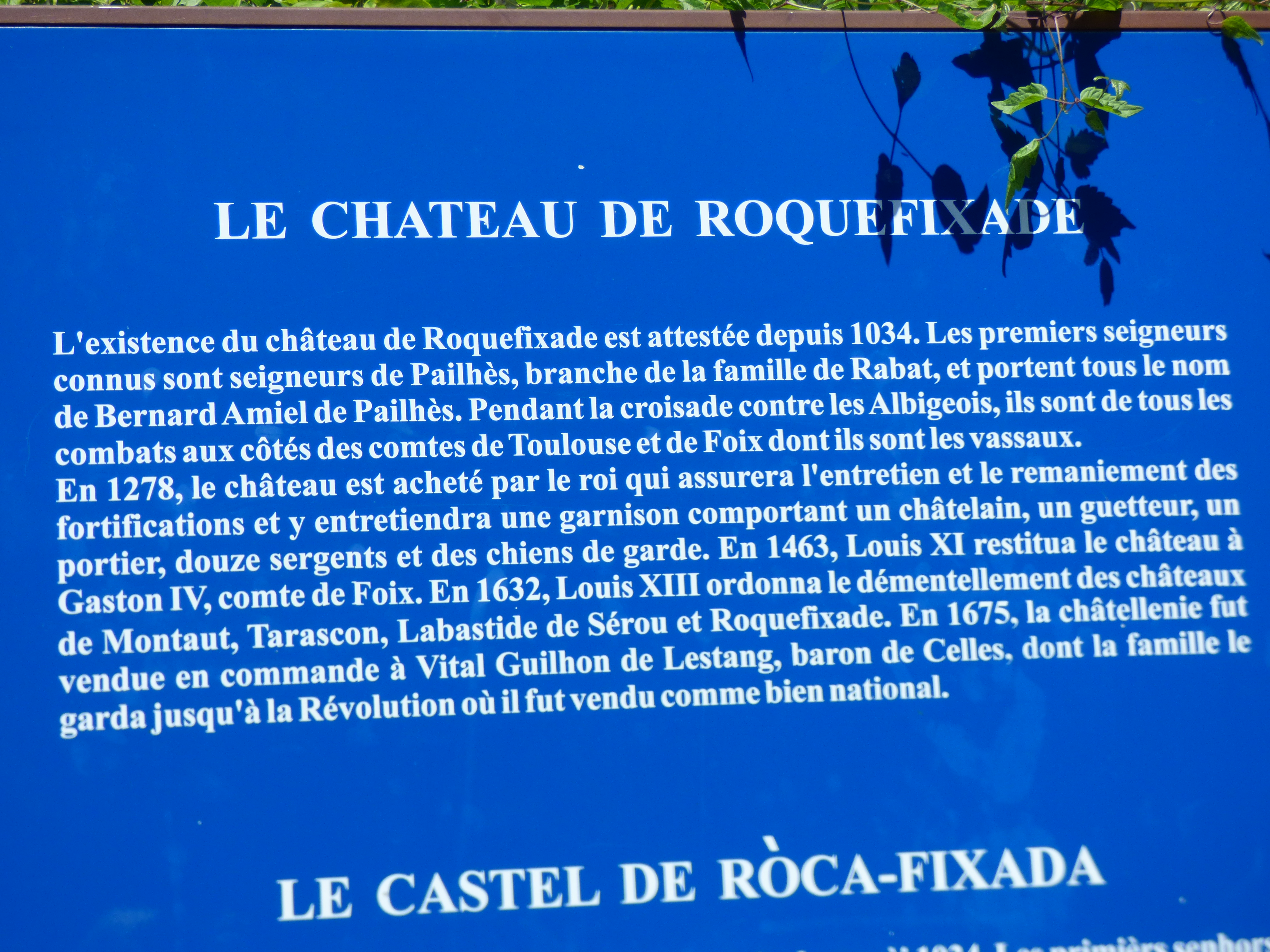 De Roquefort les cascades nous continuerons ensuite notre route vers Roquefixade. Nous avions remarqué le château depuis la route en allant à Lavelanet mais nous n’avions jamais fait le détour (grossière erreur, village et château ont un charme fou!). Le château de Roquefixade daterait du XIe siècle, existence attestée depuis 1034 nous dit le panneau explicatif.