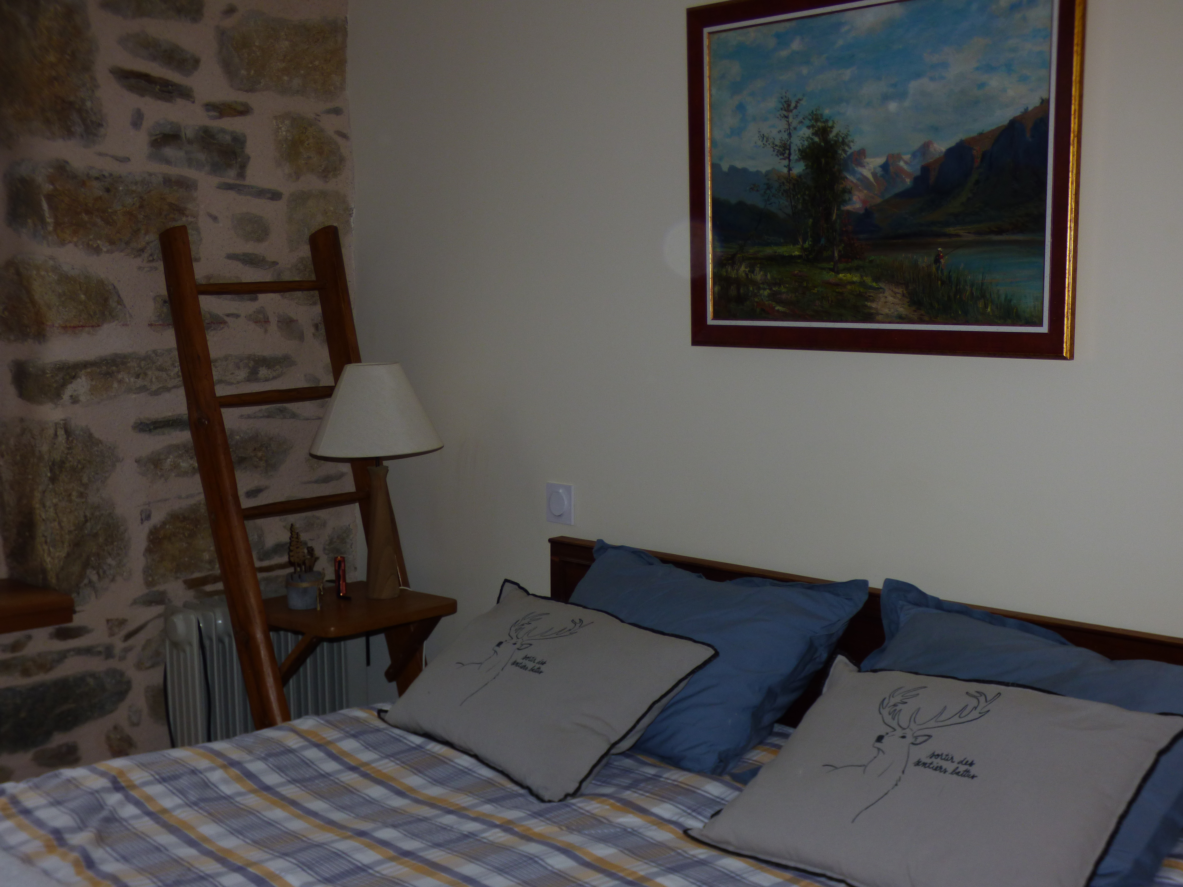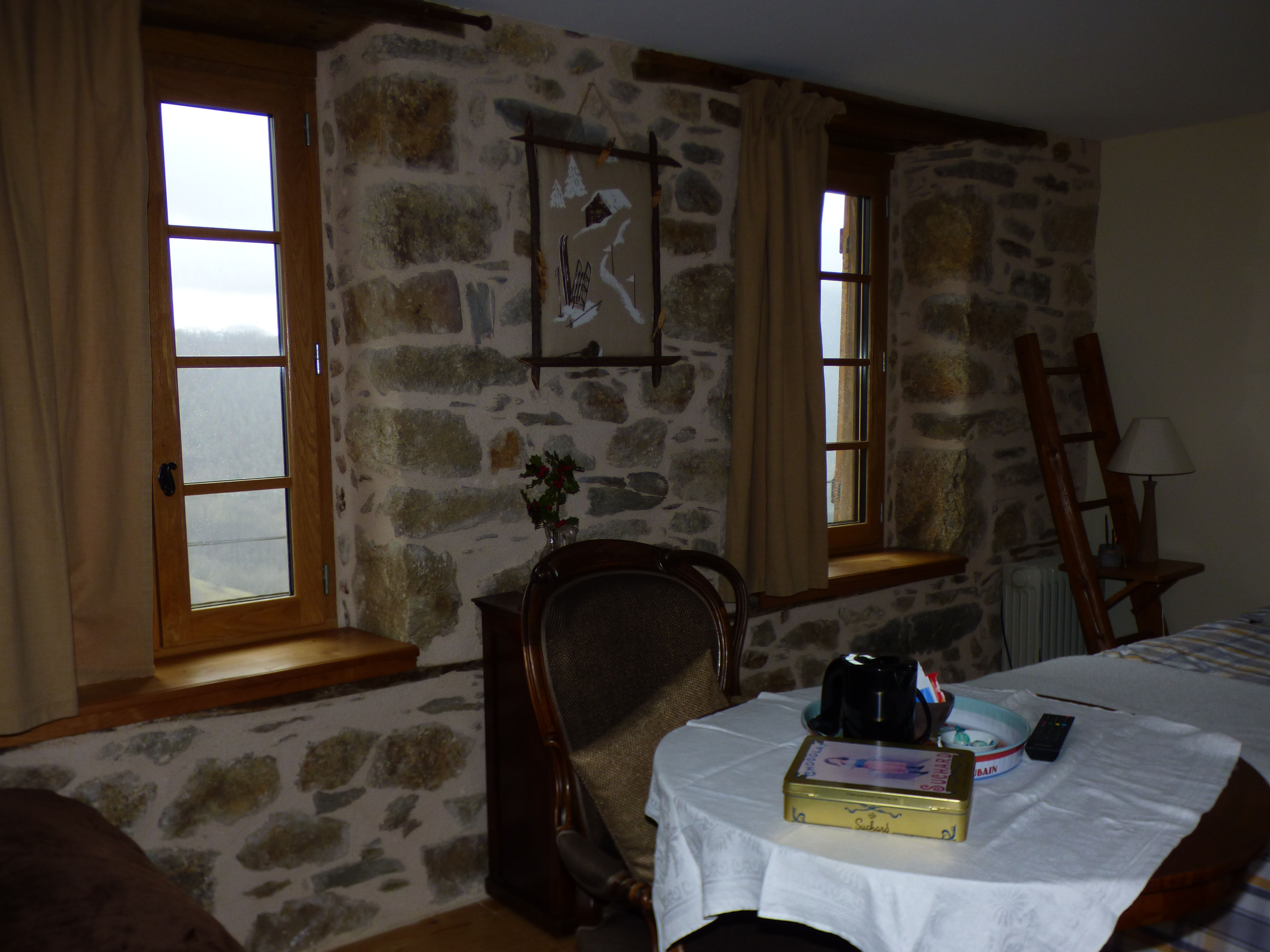 La chambre Journalade du nom du pic visible par le vélux (à condition d’être grand) est plus petite. Comme toutes les chambres sous les toits l’espace est plus exigu. Les deux chambres contenaient la réserve de foin pour les bêtes l’hiver. C’était un même espace. Les poutres d’origine, le recoin où l’on peut prendre thé ou café devant la grande fenêtre par laquelle nous montions l’herbe séchée donnent à Journalade beaucoup de charme.