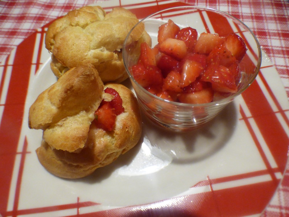 Nous avons tout d’abord réalisé de petits choux garnis de crème pâtissière et de fraises et nous les avons servis avec un petit accompagnement de fruits.