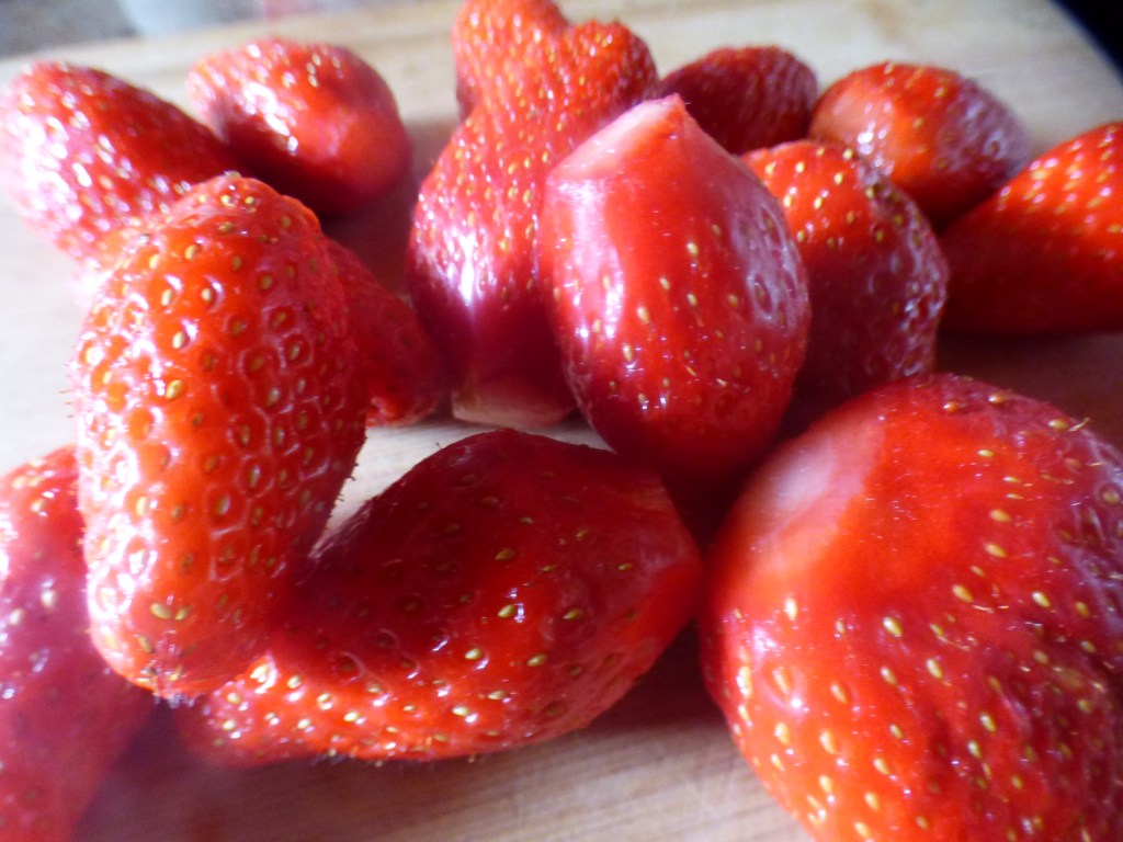 Ensuite nous avons choisi de servir des coupes de fraises avec de la crème anglaise. Pour cela nous avons d’abord réalisé la crème avec un demi-litre de lait, 4 oeufs, un peu de sucre et un sachet de sucre vanillé bio. Nous mélangeons tout d’abord les jaunes d’oeufs et le sucre. Puis très progressivement nous ajoutons le lait préalablement bouilli. La préparation est ensuite remise sur feu doux, très doux. On remue sans arrêt jusqu’à ce que la crème nappe la cuillère. Nous laissons refroidir la préparation et pendant ce temps nous nous occupons des fraises.