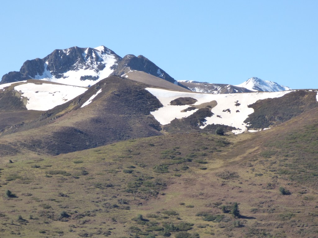 Après une petite pause café et photos ( nous avons tout notre temps ) nous revenons un petit peu sur nos pas pour prendre la direction du Sarrat de la Pelade. Le sentier se perd un peu mais on vise la crête. Pas la moindre difficulté ici. Fin avril quelques petits névés tenaces nous obligent à faire de petits détours. Nous laissons sur notre gauche le Pech de Therme nous ferons un petit crochet au retour. Les paysages si familiers pourtant, nous émerveillent toujours autant : sur notre gauche la Devèze et sa cabane en contre-bas, sur notre droite la vallée de Saurat. Les crêtes sont belles sous le soleil et la nature reprend vie après la neige.