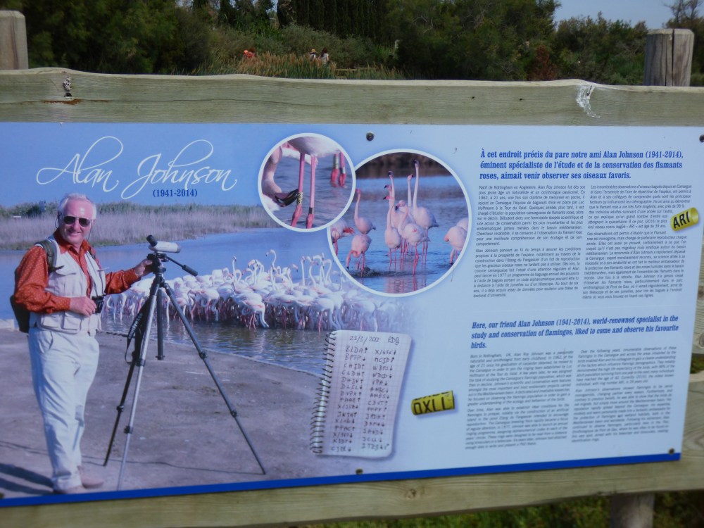 Rien n’est laissé au hasard ici, hommage bien légitime est rendu à Alan Jonhson ornithologue renommé et spécialiste mondial des flamants roses qui a inlassablement observé, travaillé à la connaissance et à la protection des espèces.