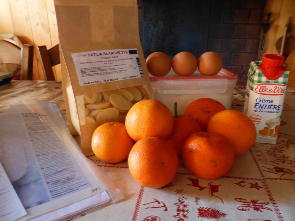 Première étape donc, réunir tous les ingrédients nécessaires à la recette : farine T45, sucre, oeufs, crème, mandarines bio de préférence, chocolat blanc, thermomètre à sucre, plaque à pâtisserie, papier sulfurisé.