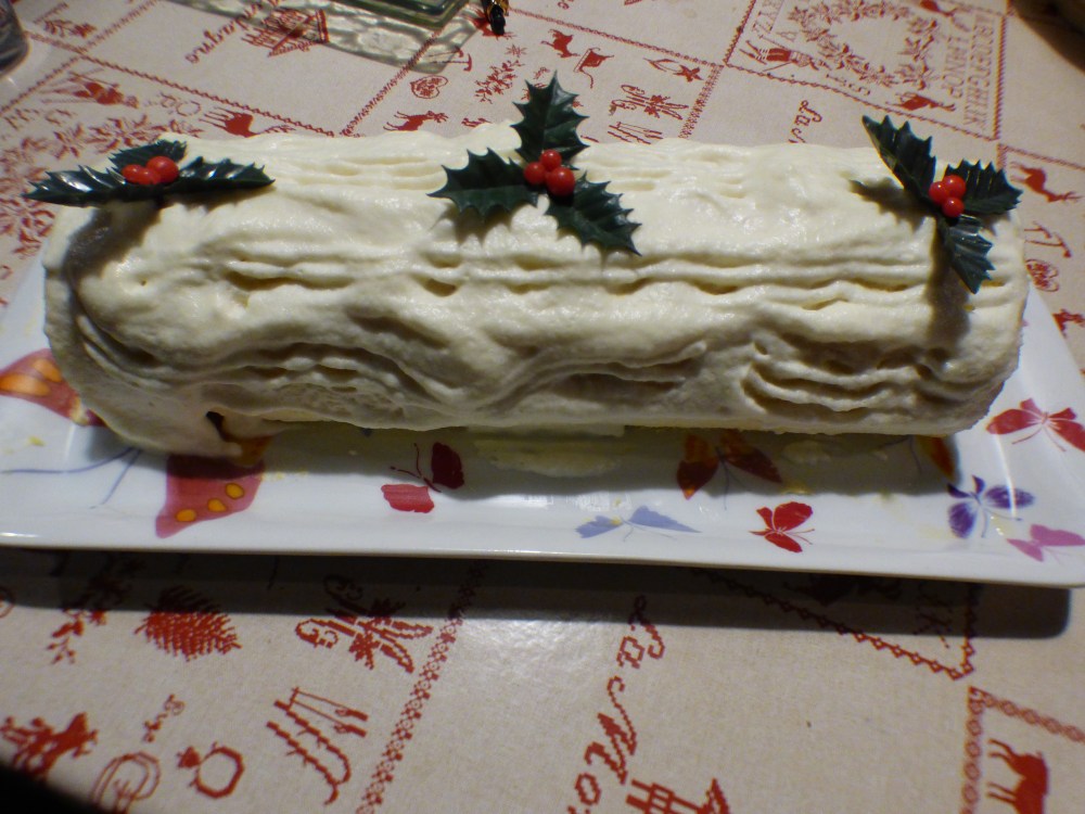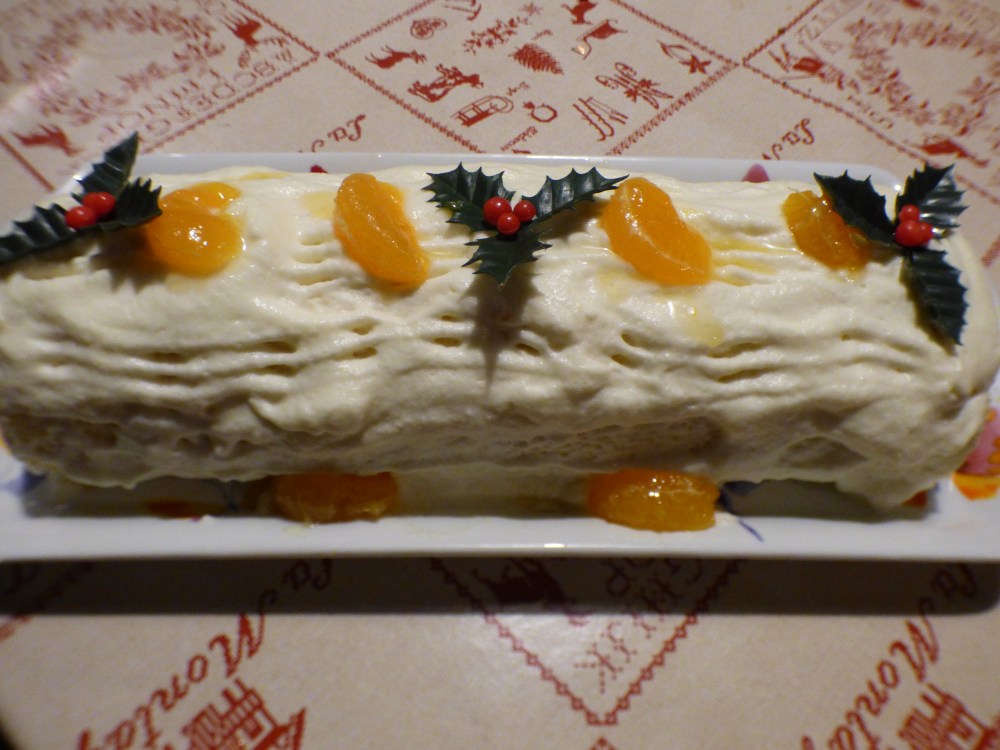 Pour le réveillon du 31 décembre voici le dessert proposé à nos hôtes : la bûche mandarine-chocolat blanc qui a fait son petit effet.