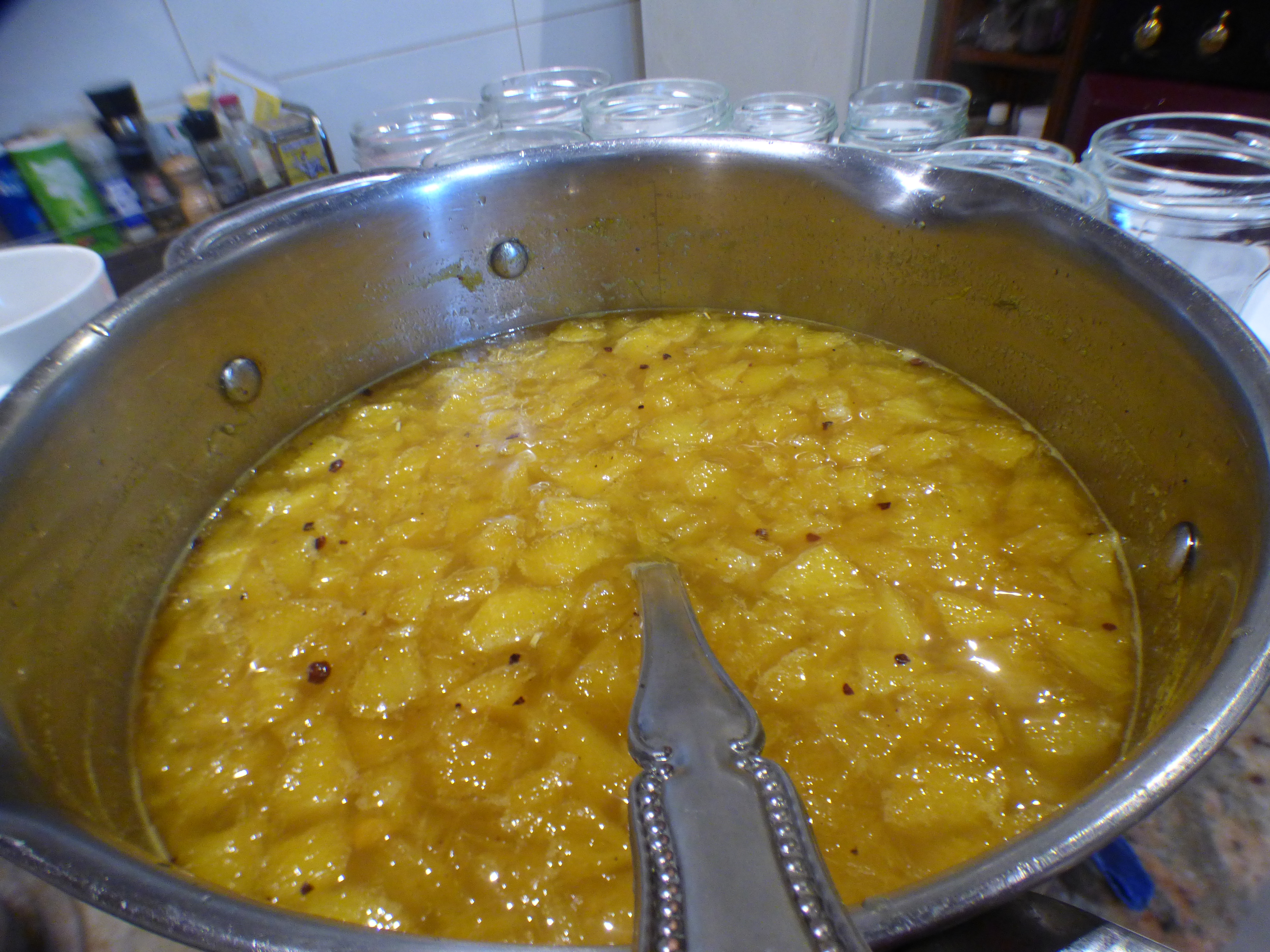 Chaque tranche est ensuite coupée en petits bouts jusqu’à l’obtention de la quantité désirée. Nous avons récolté ici un kilo huit de pulpe que nous enroberons de 40% de son poids de sucre bio auquel nous ajouterons des épices à vin chaud. Après une nuit de macération la cuisson marquera l’étape finale de notre préparation.