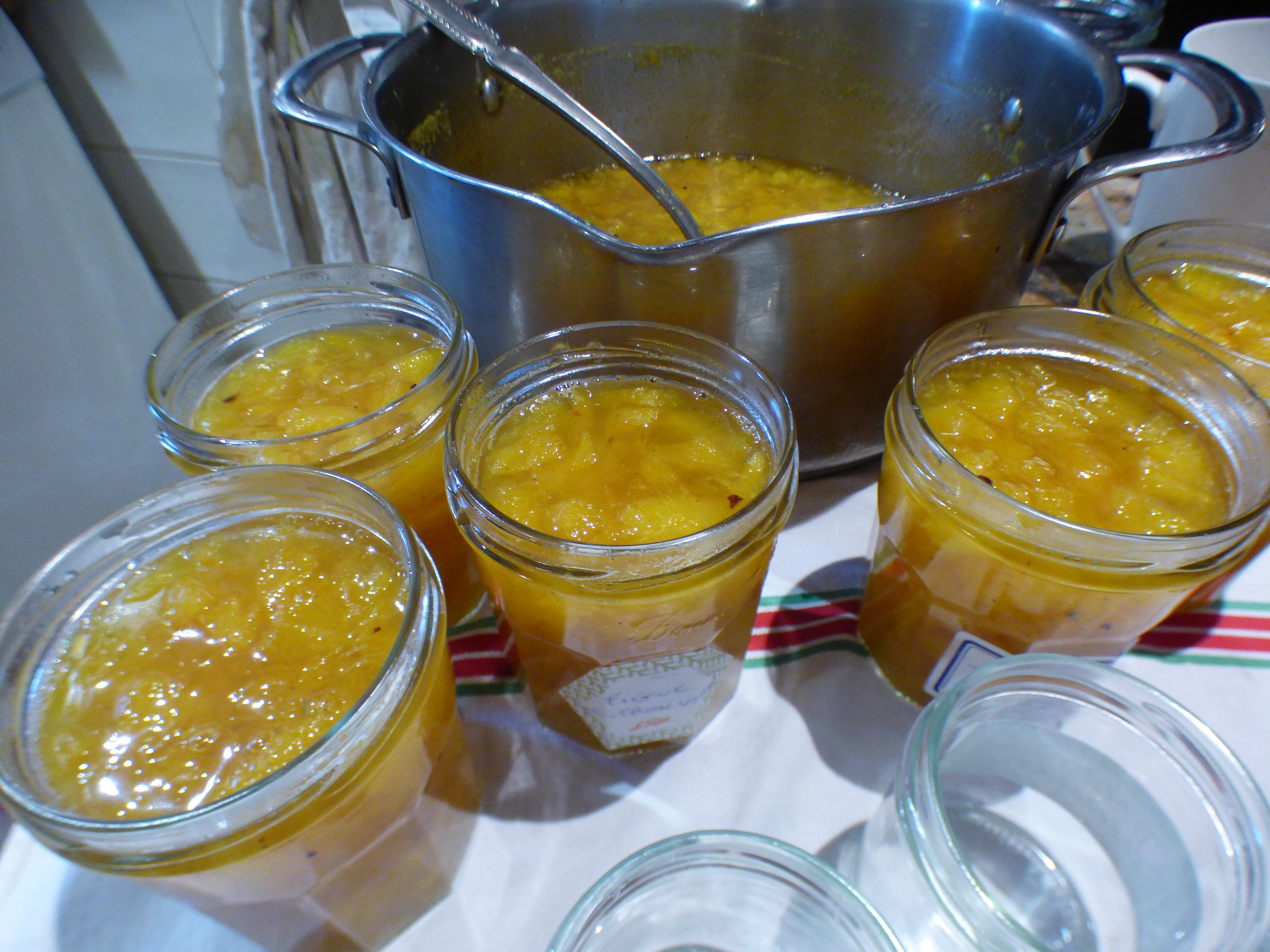 Pour réaliser cette marmelade j’ai donc utilisé 4 kilos d’oranges bio. Pour 1 kilo 800 de préparation ensuite, j’ai rajouté 700 grammes de sucre et des épices à vin chaud. Après une nuit de macération la cuisson a été effectuée en 40 minutes. Deux minutes avant la fin de la cuisson 2 sachets d’agar-agar ont été rajoutés. Après mise en pots puis refroidissement la stérilisation a pris 20 minutes à compter du temps d’ébullition. Pas de stérélisateur ici, cette étape finale a été réalisée à l’ancienne dans un grand faitout.