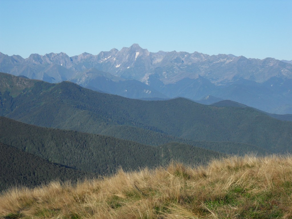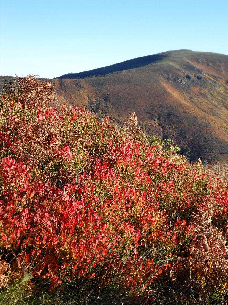 Les myrtilles foisonnent bien avant le sommet, cependant le goût de la randonnée prime : marchons d’abord et cueillons ensuite. Arrivés à Estibat en prenant la crête de Liers nous pouvons voir sans être vus et c’est parfait. Coup d’œil au paysage connu et reconnu mais tellement beau que la lassitude ne risque pas de nous gagner. Face à nous le Vallier toujours différent selon l’heure et la lumière, et sur notre droite Le Péré au loin. Il m’arrive souvent de rêvasser en pensant que de là devaient être bien visibles les flammes qui le ravagèrent une nuit du début du XXeme siècle.