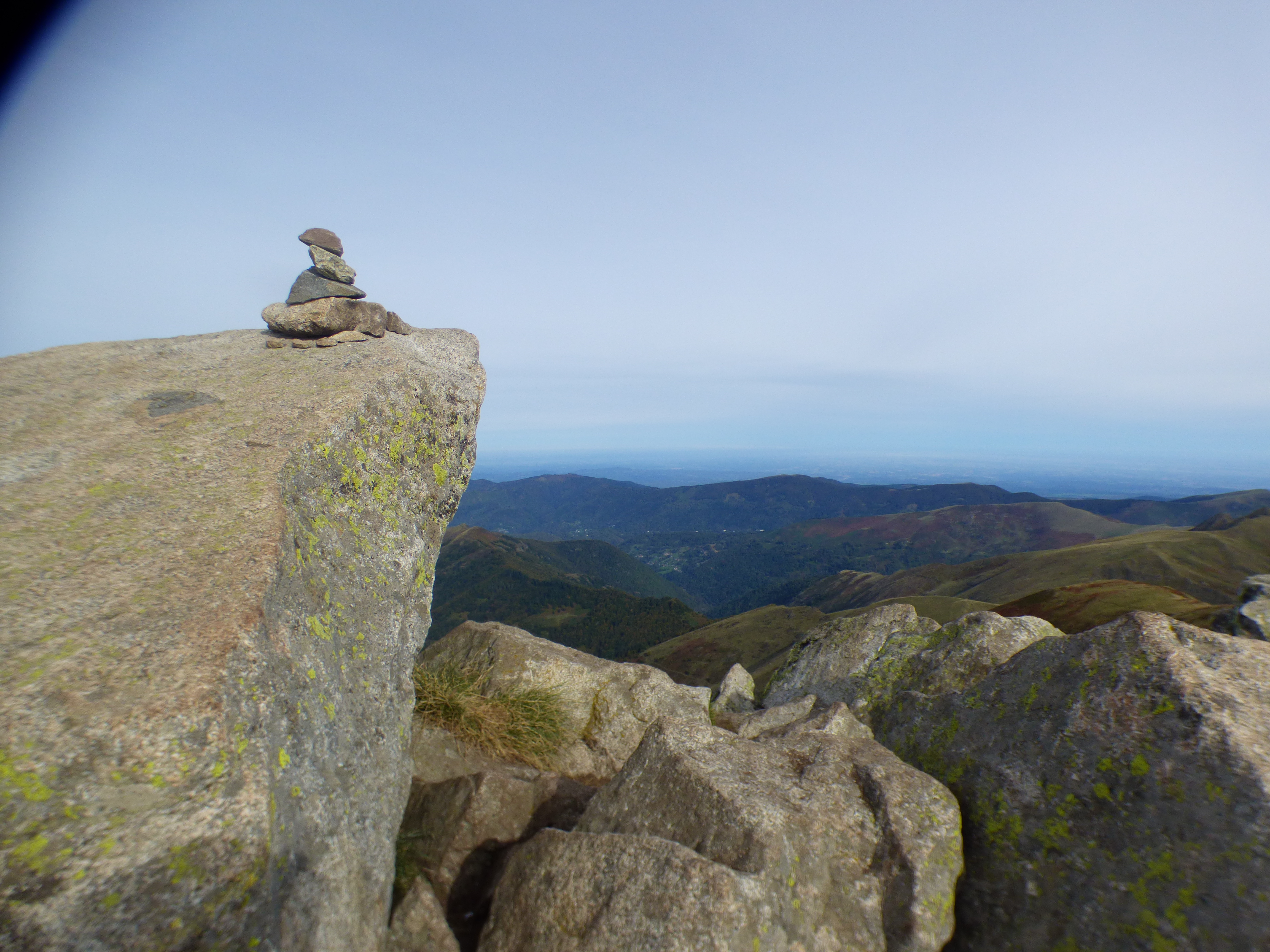 Nous ne sommes plus loin. Bientôt se profilera la première croix. Quelques bonnes minutes d’ascension de gros rochers et j’aurai le privilège d’ être seule au sommet pour quelques minutes. Long regard sur les montagnes frontalières, puis Massat et Biert, Goutets en contre-bas le village d’estive en pierre sèche, et très loin tout petit le Péré.