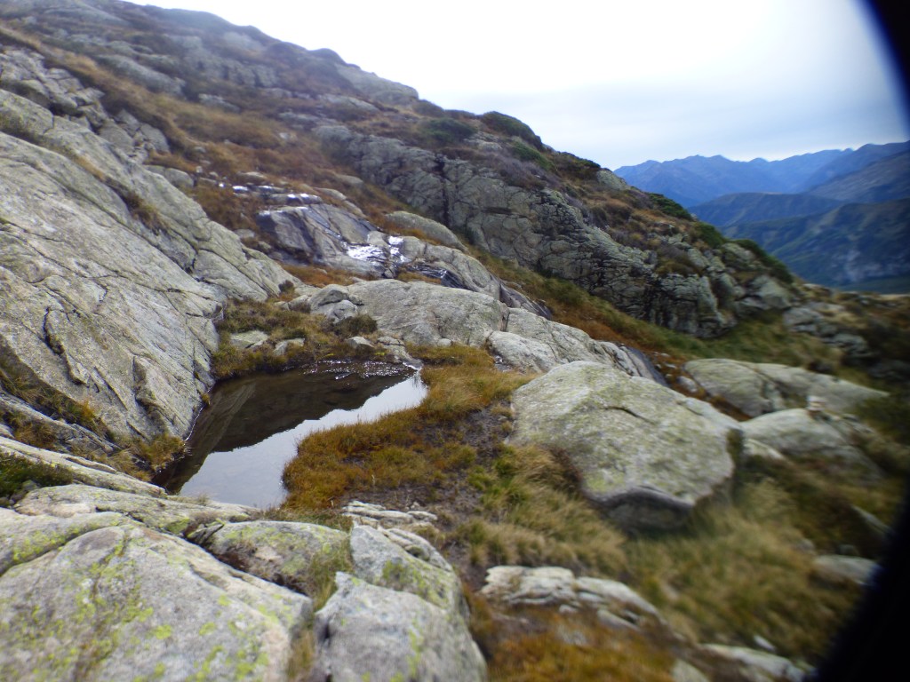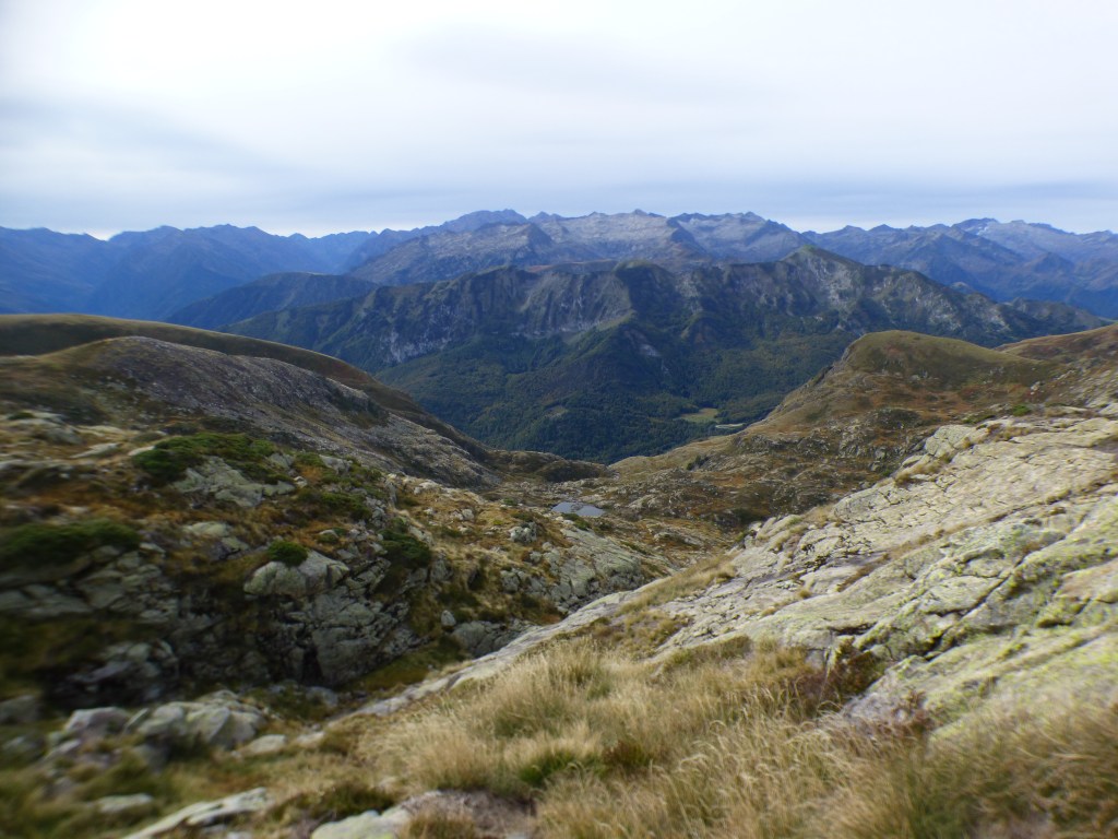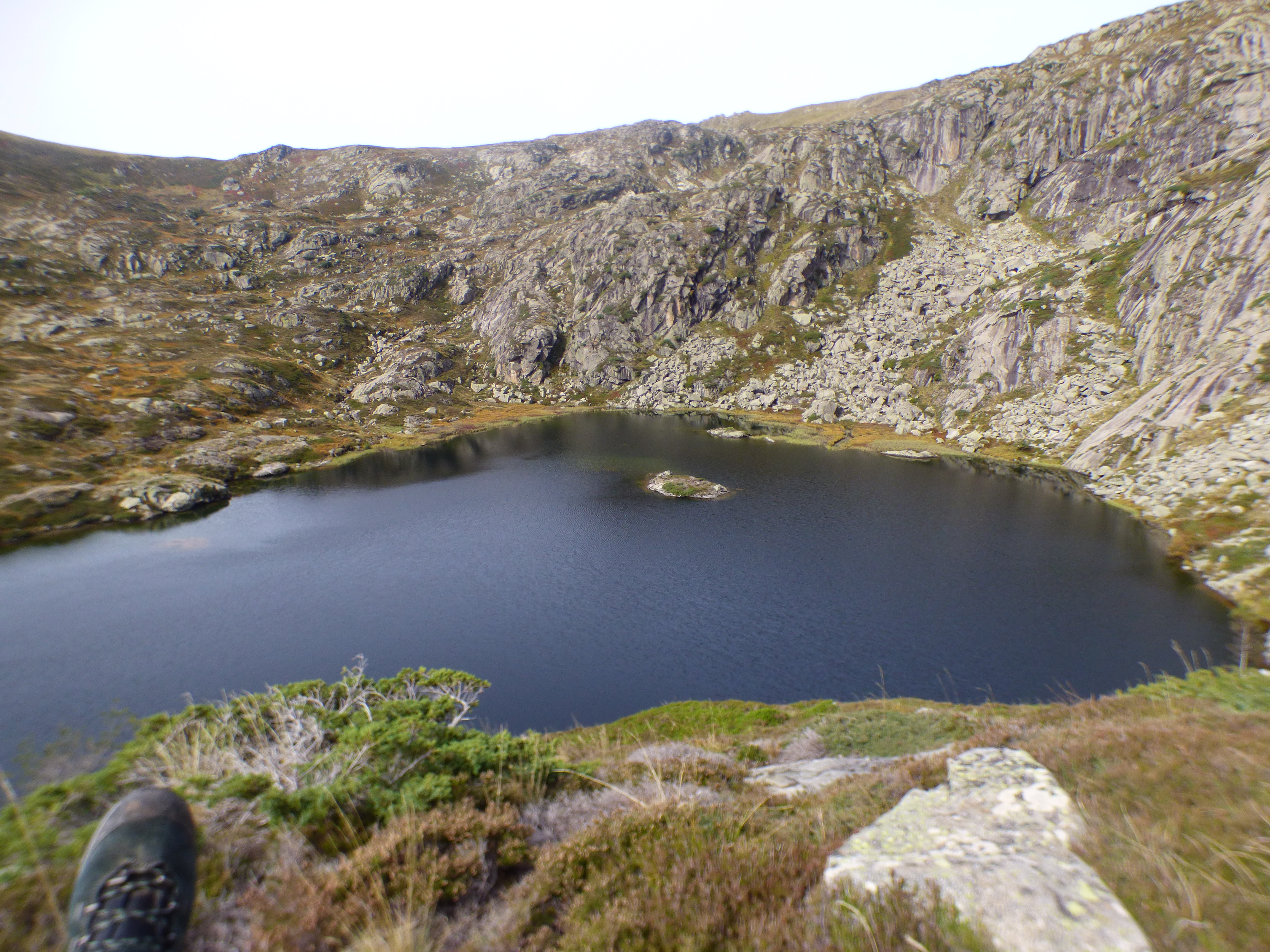 La descente se fait dans un paysage minéral avec nombreux petits laquets et en contrebas l’étang d’Arbu. L’attention est nécessaire mais le tracé parfait . Les premières couleurs bien que peu prononcées sont bien là : pieds de myrtilles, grandes herbes jaunies, la mutation a commencé.