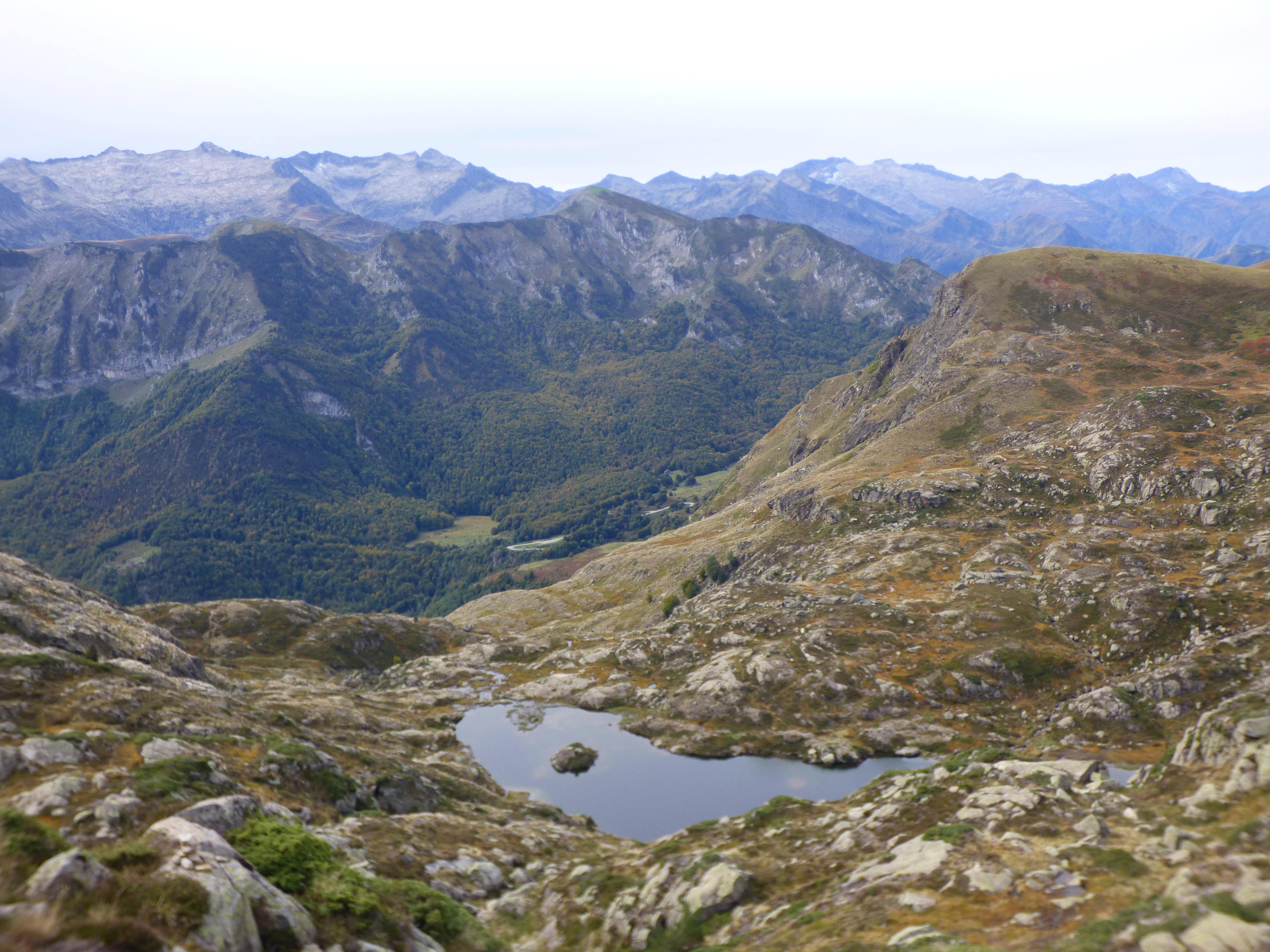 On surplombe l’étang d’Arbu où deux ou trois couples profitent de la lumière d’automne au bord de l’eau. Long moment d’observation sur le rocher en amont, le temps s’arrête là pour quelques instants.